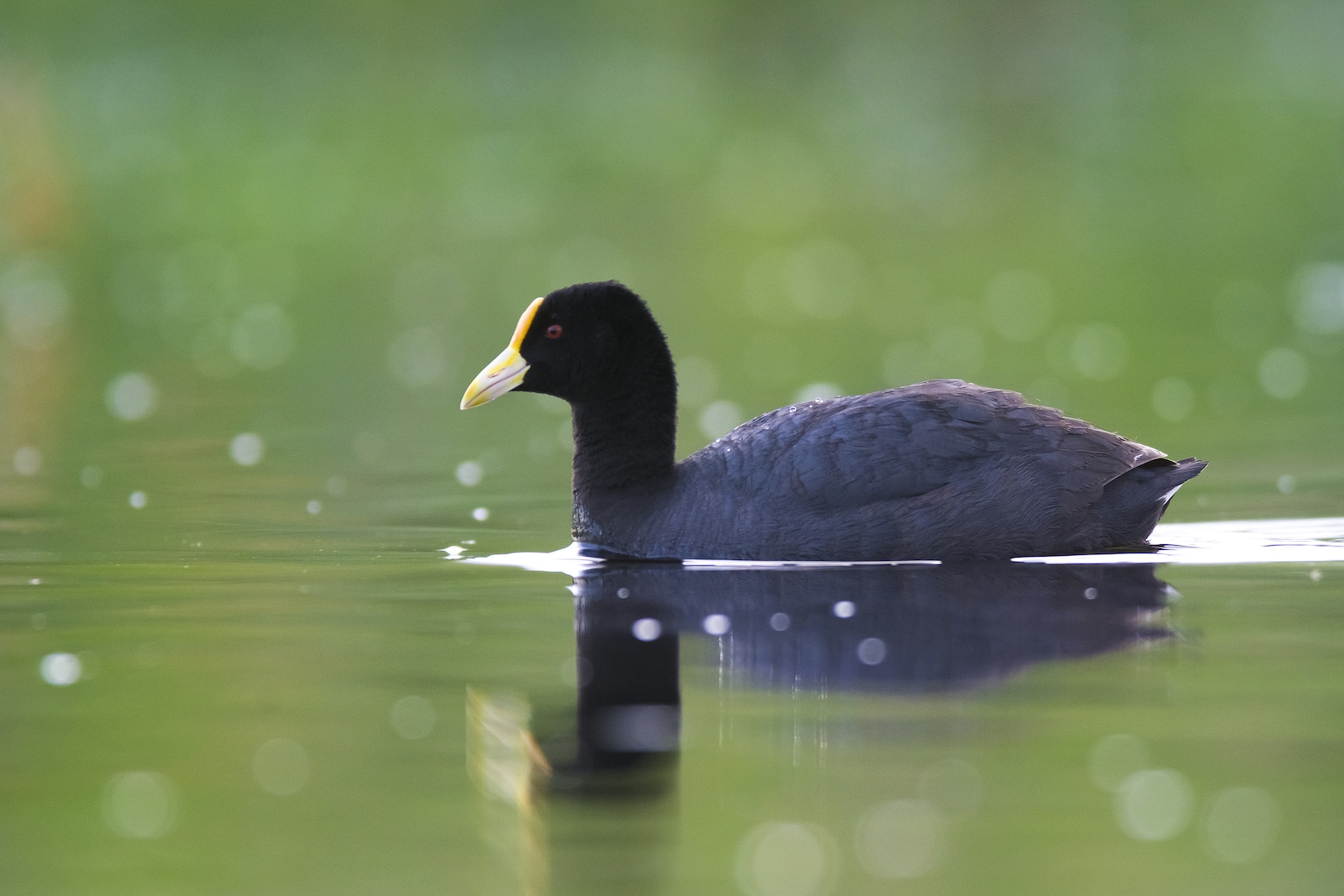 - Se reconoce por su plumaje oscuro, su pico rojo con punta amarilla y sus patas verdosas, perfectas para caminar entre la vegetación acuática