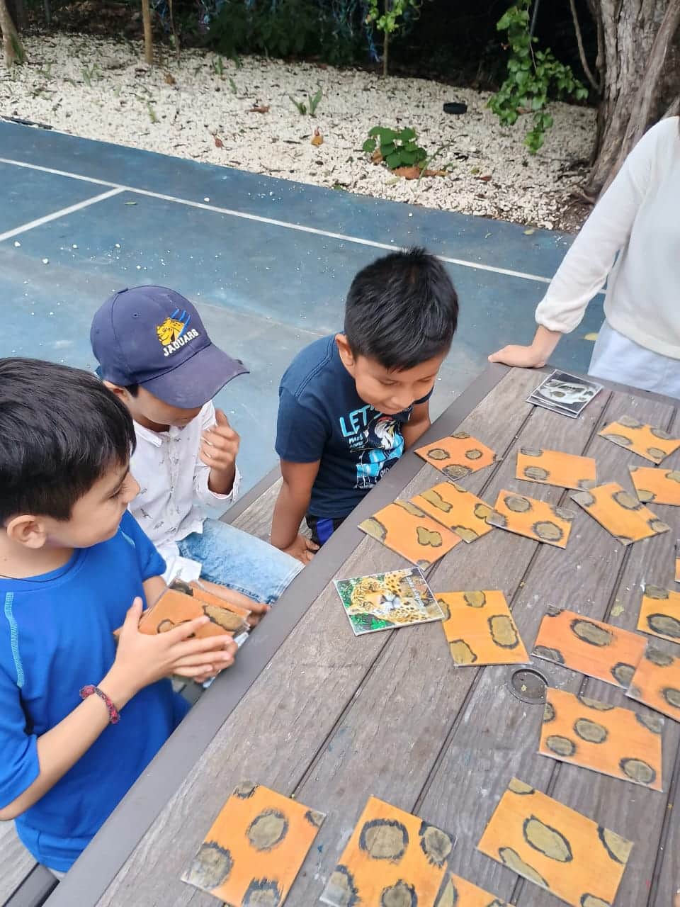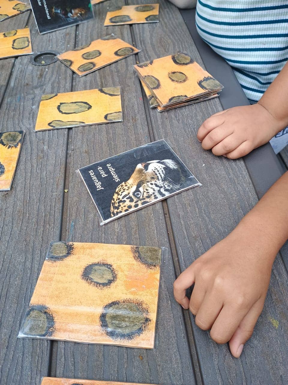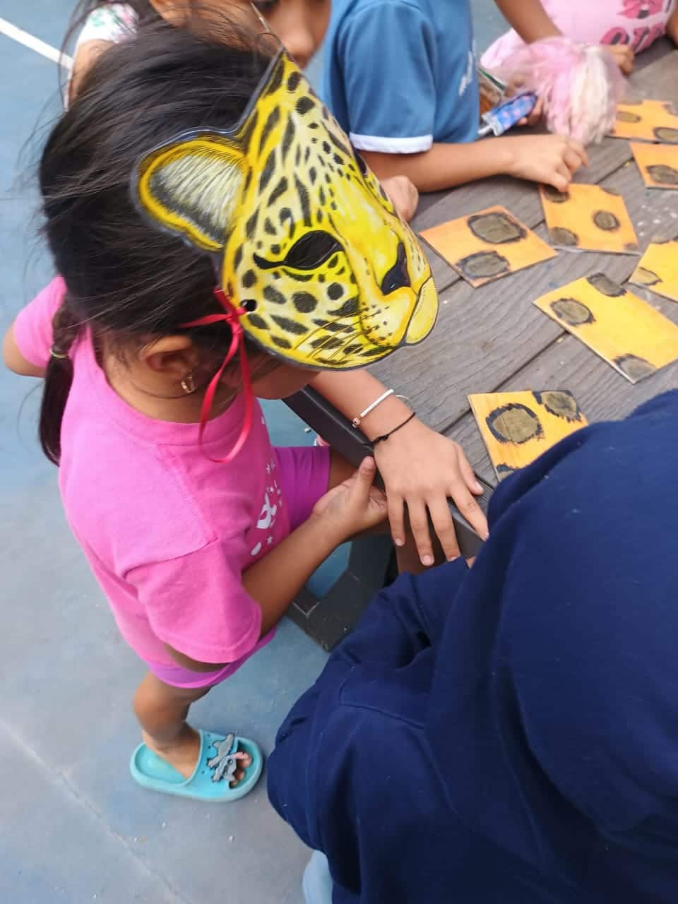 Mediante imágenes reales de huellas, distribución, anatomía y colmillos del jaguar, las niñas y los niños aprendieron a identificarlo como una especie clave de la selva. A través de un memorama educativo, surgieron preguntas, hipótesis y nuevos aprendizajes que fortalecieron su comprensión de la fauna local.